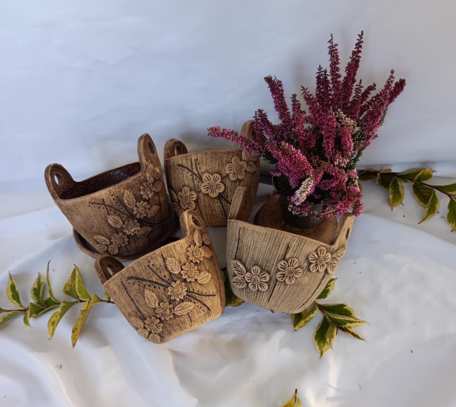 Ručně vyráběný květináč z keramiky s reliéfem květů