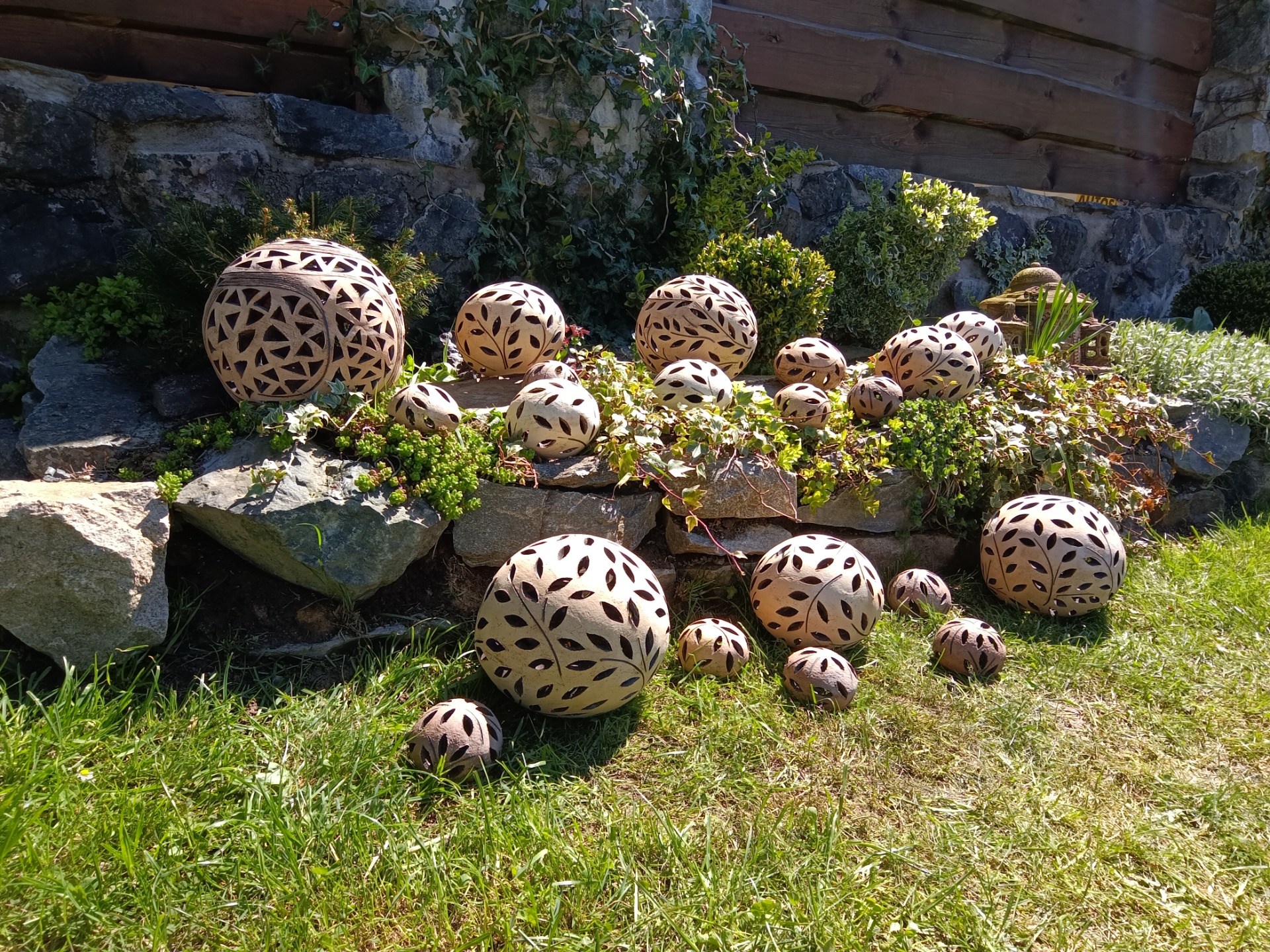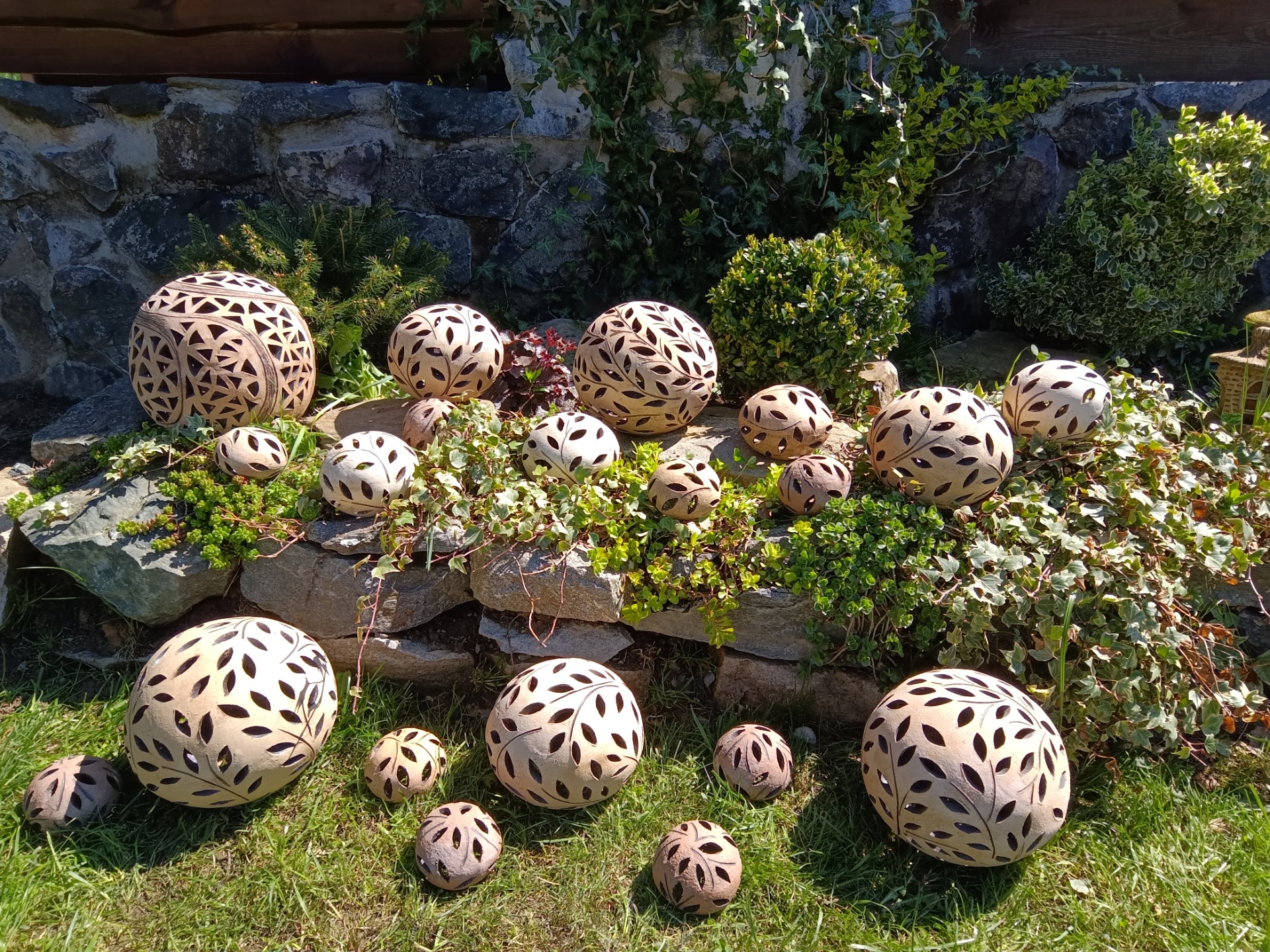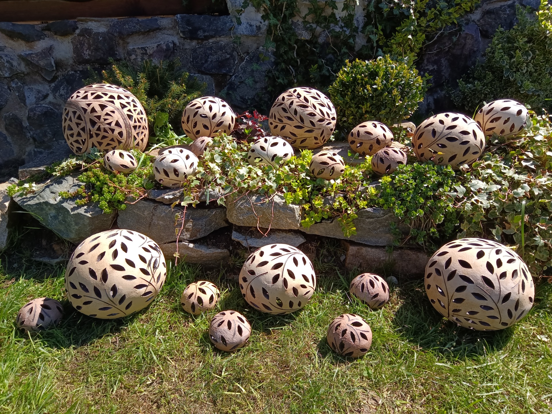 Přírodní keramika Stylové zahradní koule z přírodní keramiky s detailně vyřezávanými ornamenty. Každý kus je ručně zpracovaný, takže působí jako originální umělecký prvek do zahrady, na terasu nebo k jezírku. Ozdoby