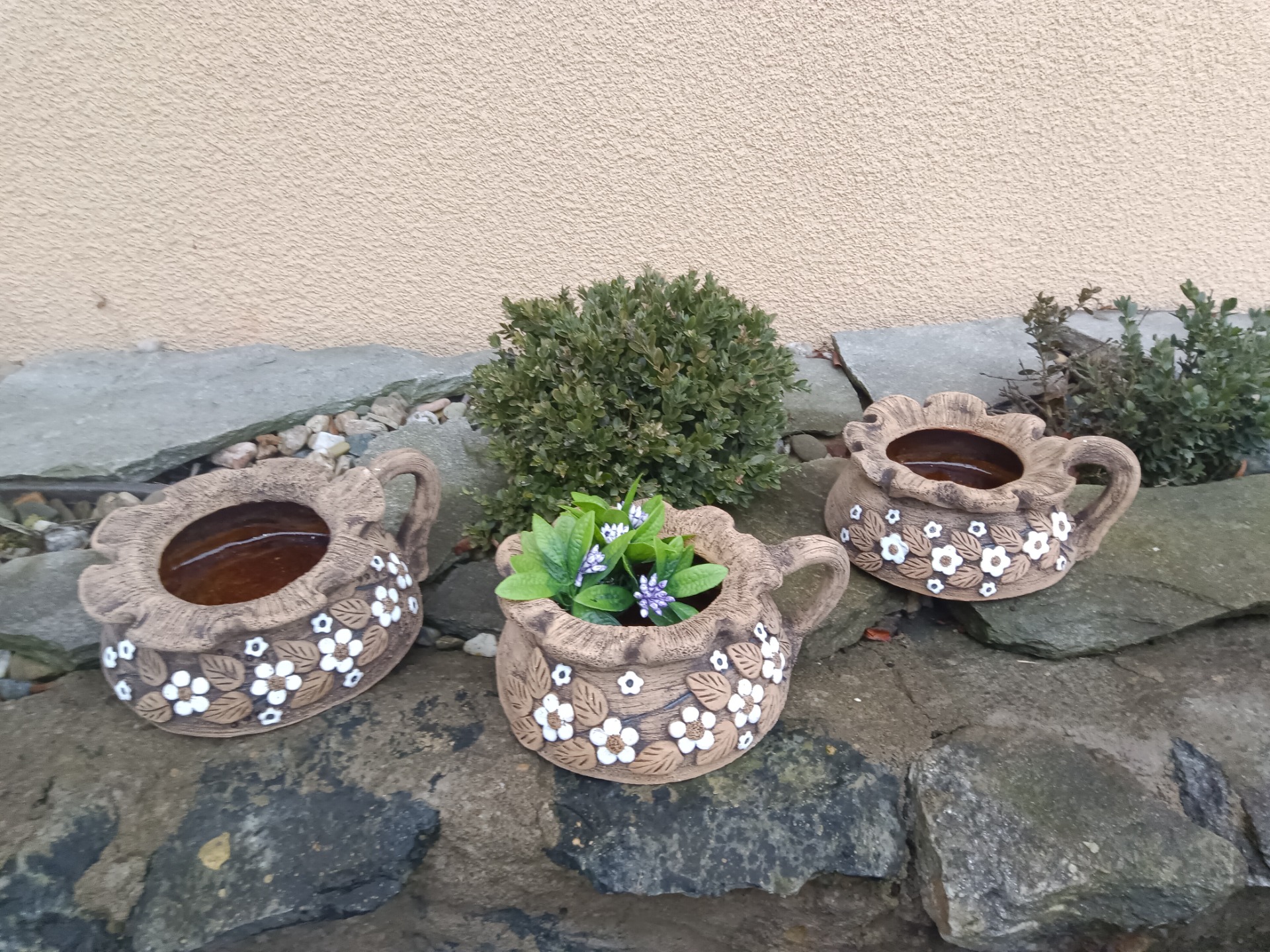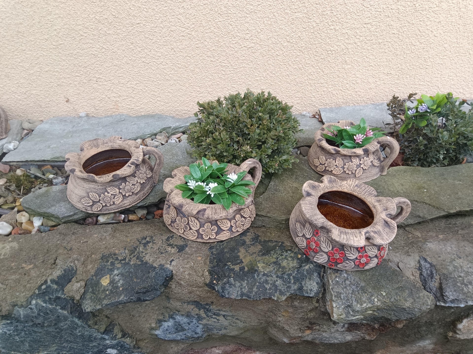 keramické květináče s plastickým květinovým dekorem. Každý kus je originál s přírodním rustikálním vzhledem, jemně strukturovaným povrchem a ozdobným uchem. Vhodné pro drobné květiny, bylinky nebo sukulenty, do zahrady, na terasu i ke vchodu domu. Mrazuvzdorné, s drenážním otvorem, ladí s přírodním i venkovským stylem.