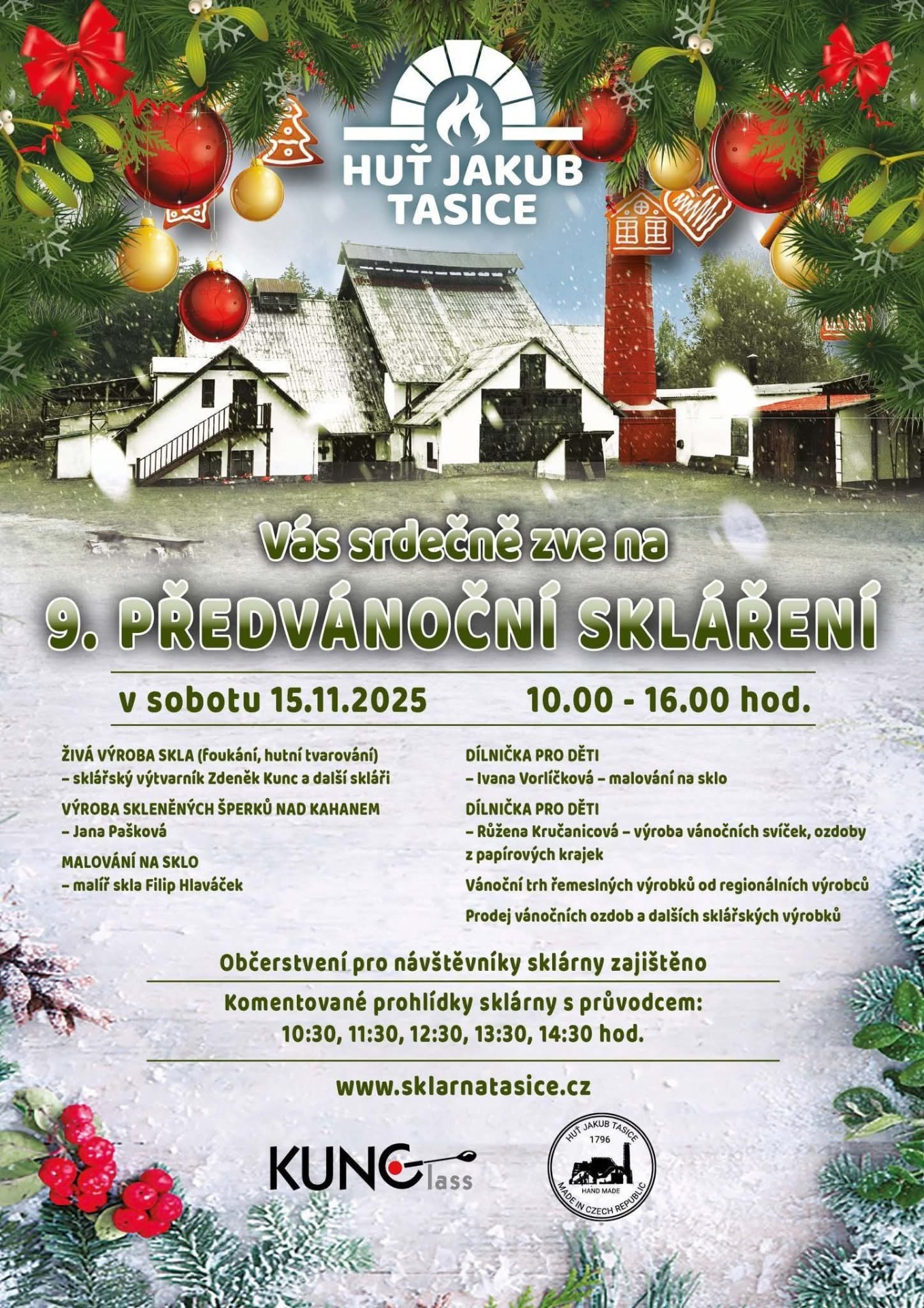 V sobotu 15. listopadu 2025 budeme prodávat na 9. Předvánočním skláření v Huti Jakub Tasice.